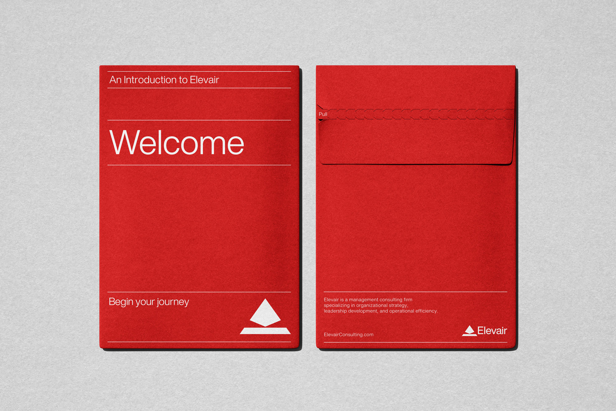 About Elevair is a management consulting firm focused on helping organizations rise above complexity and move confidently toward their next stage of growth. Through clear thinking, strategic insight, and disciplined execution, Elevair partners with leaders to elevate performance, sharpen direction, and unlock long-term value. Brand strategy Elevair’s brand strategy centers on clarity, momentum, and leadership. The firm is positioned as a trusted strategic partner—calm, intelligent, and decisive. The brand communicates elevation not as hype, but as progress: guiding clients upward through structured thinking, informed decisions, and measurable outcomes. Every touchpoint reinforces confidence, sophistication, and forward motion. Naming The name Elevair is abstract yet meaningful, referencing elevation, progress, and upward movement. The “Air” ending introduces a sense of lightness and ease, balancing the rigor of management consulting with a feeling of clarity and openness. The name is distinctive, flexible, and designed to grow alongside the firm and its clients. Logo The logo features an abstract triangle forming a floating pyramid—symbolizing elevation, stability, and strategic focus. Its upward orientation reinforces growth and progress, while the floating form conveys lightness and perspective. The mark is simple, confident, and adaptable across digital and physical applications. Creative Direction & Brand Identity Elevair’s visual identity emphasizes refinement and structure. Thin lines are used throughout compositions to suggest varying elevations and strategic layers, creating a sense of movement and hierarchy. A bold red anchors the brand with confidence and energy, while black and white provide balance and restraint. Together, these elements create a modern, elegant system that reflects Elevair’s role in helping organizations rise with clarity and purpose.
