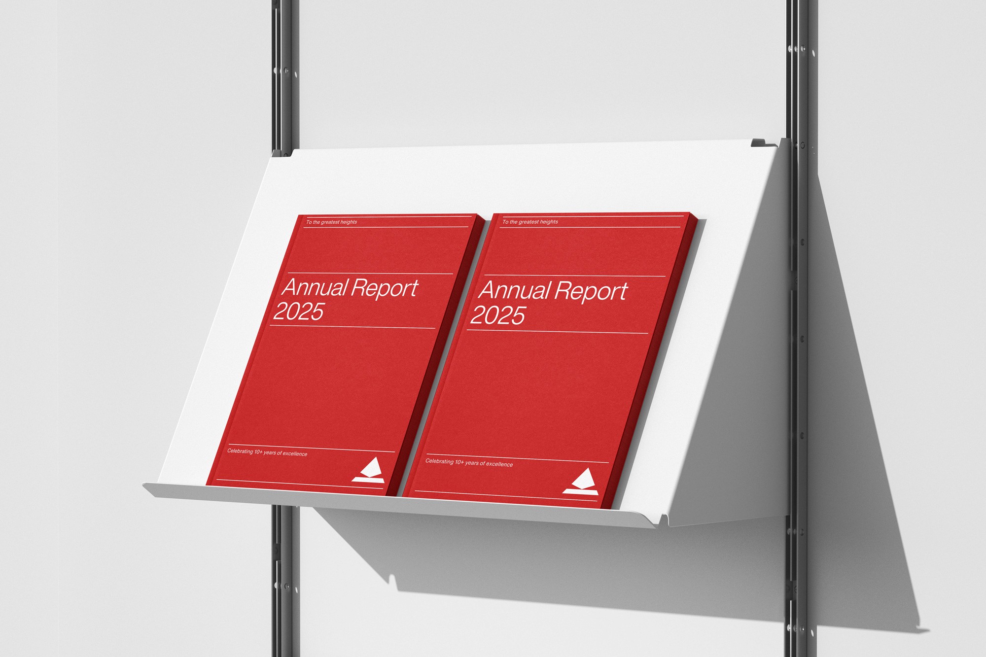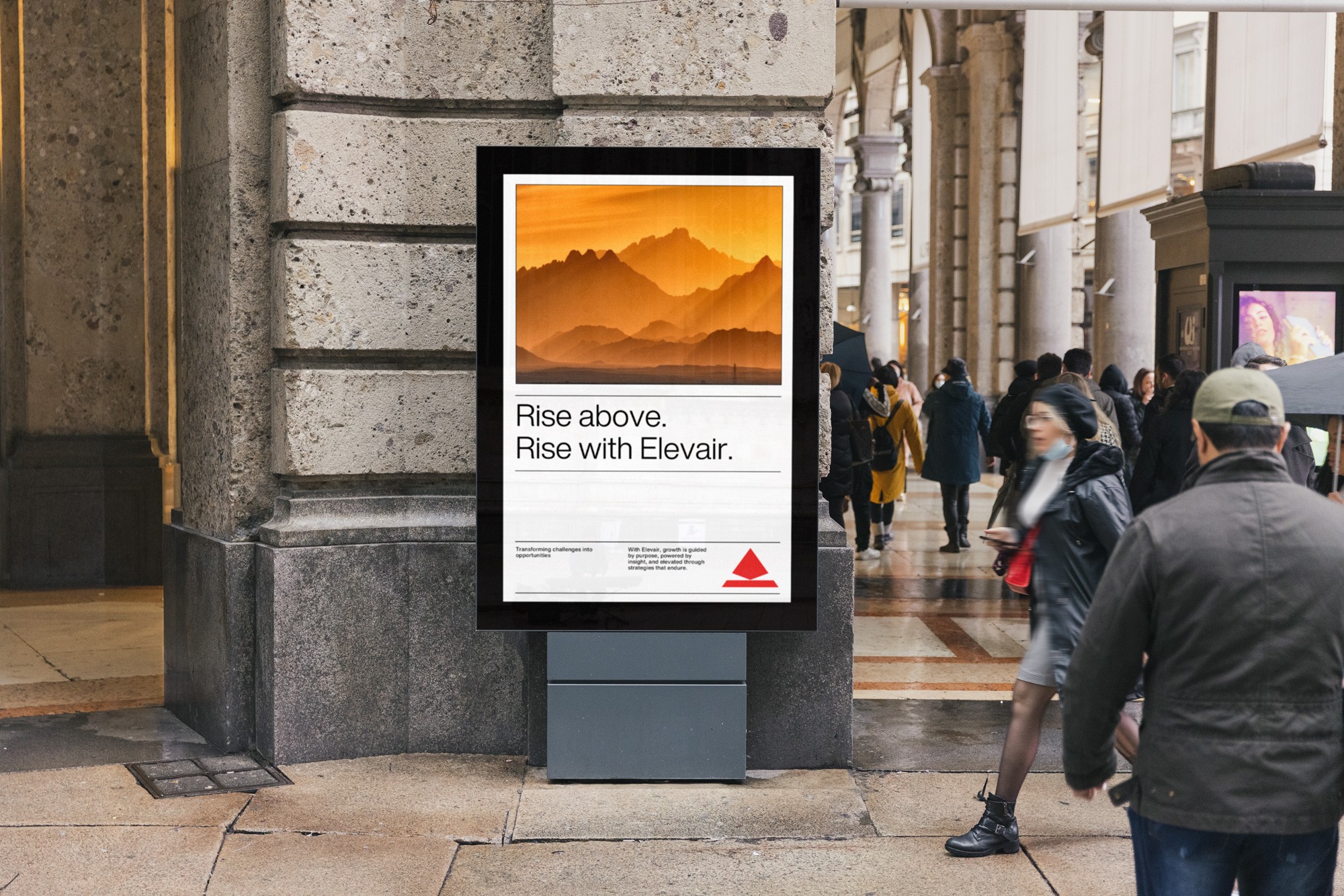 Elevair’s visual identity emphasizes refinement and structure. Thin lines are used throughout compositions to suggest varying elevations and strategic layers, creating a sense of movement and hierarchy. A bold red anchors the brand with confidence and energy, while black and white provide balance and restraint. Together, these elements create a modern, elegant system that reflects Elevair’s role in helping organizations rise with clarity and purpose.