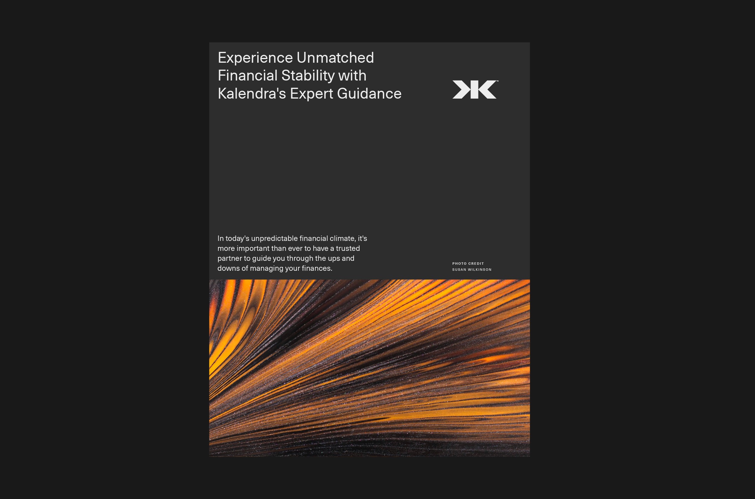 The brand identity uses a dark, sophisticated palette paired with rich photographic textures to evoke luxury, depth, and a sense of discretion. Visual elements emphasize stability and refinement, creating an elevated aesthetic that mirrors Kalendra’s commitment to expert, personalized financial guidance. The overall identity conveys confidence, elegance, and the understated strength of a firm that clients can rely on.