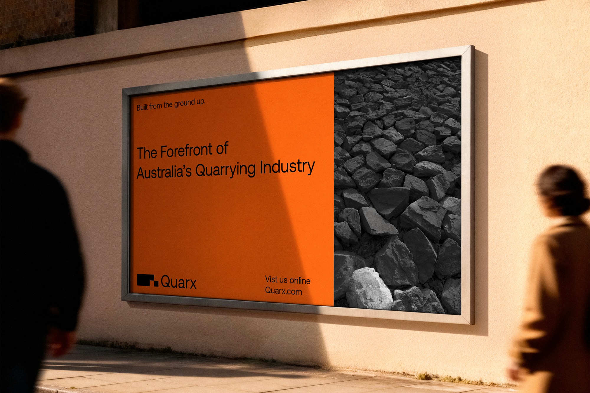 The visual identity is built around photography of the rock and aggregate Quarx extracts, creating a refined, tactile texture system that is both sophisticated and easy to implement across applications. A primarily black-and-white palette provides clarity and consistency, while a vibrant orange accent introduces energy and visibility—reflecting both safety signaling in industrial environments and the brand’s confident, modern edge.